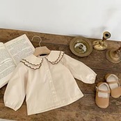 ブラウスの襟とオーバーオールのフリルが